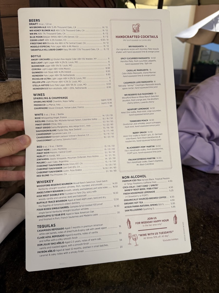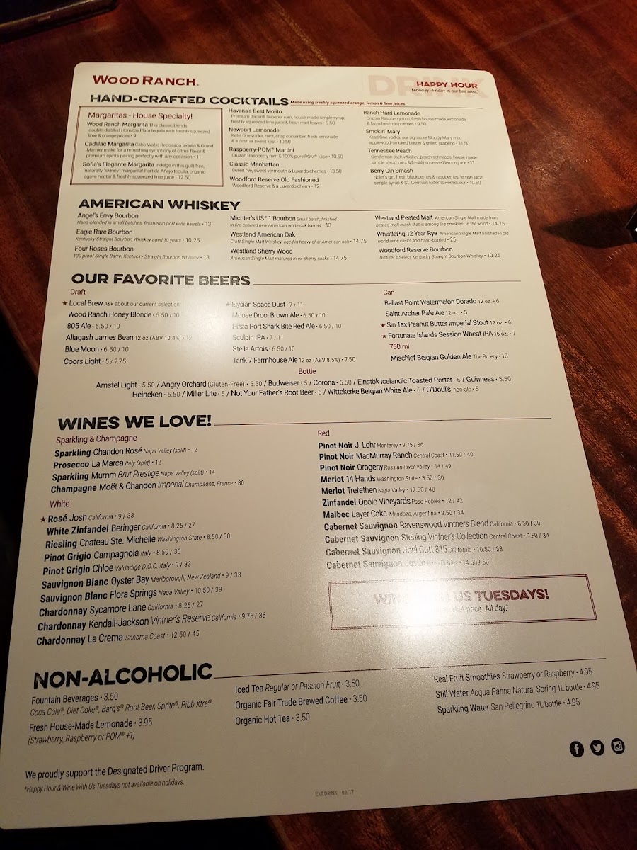 We had a great dinner tonight at Wood Ranch. I had top sirloin which had no fat on it and a baked potato and beans and two of us had La Crema Chardonnay which was outstanding. One of us also had chicken breasts that were tender with beans and steak. The last person had tri-tip sweet mashed potatoes and grilled broccoli service was great food was hot and delicious! Oh yes and don't let me forget about the garlic butter rolls that were great!